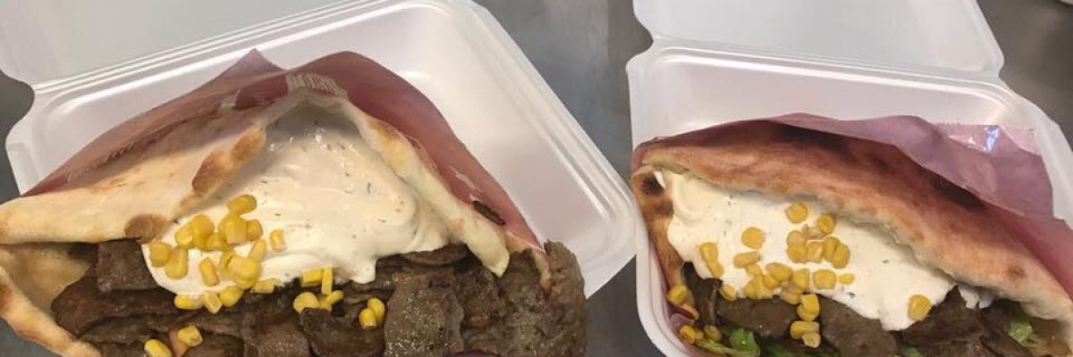 Biffkjøtt, pitabrød, kyllingkjøtt, chips, salat, tomat, agurk, løk, mais og hivtløkssaus.